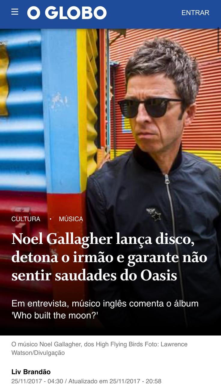 E o drama de quando eu perdi o show em 2009 por estar internada, com ingresso comprado e tudo? E se voltar no tempo, eles embalaram minha adolescência com meus amigos em Caxambu e o início da minha vida adulta no Rio, sempre ao lado do meu Gallagher de estimação. Teve a vez também em que aquele garoto do Facebook, sem saber de nada disso, me mandou um áudio direto de um shopping em Manchester enquanto estava tocando Live Forever e eu, besta, achei que aquilo fosse um sinal. E quando eu paguei um ônibus Rio-SP do meu próprio bolso pra entrevistar o Noel? Ou quando fiquei esperando o Liam sair do Circo Voador pra agradecer por ele ter mudado minha vida, e quem ouviu “obrigado” com aquele sotaque maldito de Manchester fui eu?